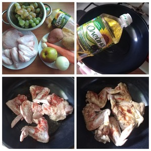 Вынимаем их на тарелку и в этой же сковороде и этом масле обжариваем немного чеснок раздавленный плоской стороной ножа, лук-полукольцами и морковь порезанную произвольно. Чистим яблоко от серединки и нарезаем его дольками. Выкладываем его к овощам. Еще немного обжариваем. В форму на низ выкладываем порезанный крупными дольками картофель, овощи со сковороды, присыпаем зёрнами горчичными и немного солью (по вкусу), перемешиваем всё. Поверх овощей раскладываем курицу. Ставим в духовку, выставив Т-180 С на 30-40 минут. Вынимаем, раскладываем виноград прямо на ветке и поливаем его сверху маслом, чтобы он немного закарамелизовался при нагреве. Хорошо взять и чёрный и зелёный виноград. У меня был только зелёный. Ставим опять в духовку при той же температуре ещё минут на 15. Ориентируйтесь по своей духовке.