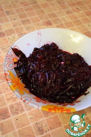 Свёклу хорошо промыть, положить в пакет для выпечки и запечь при 180 градусах в течение 1,5 часов до мягкости. Дать остыть. Натереть на крупной тёрке вместе с чесноком.