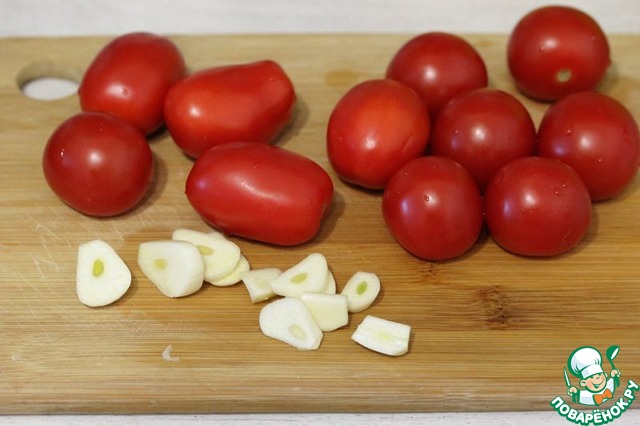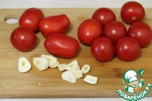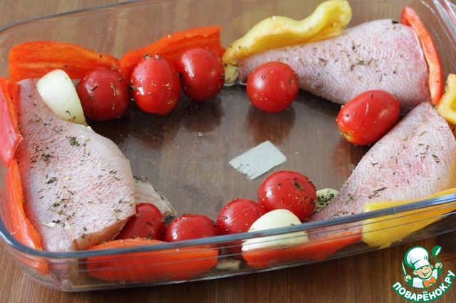 В большую форму для запекания выложить подготовленную рыбу, добавить черри с чесноком.