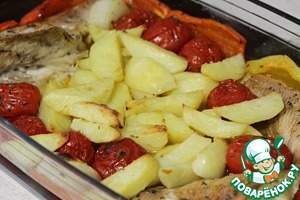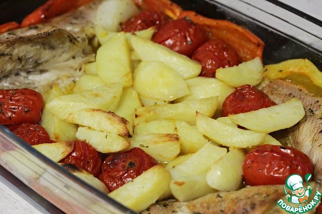 Вынуть из духовки картофель, переложить его к рыбе и поставить все обратно в духовку на 20-30 минут.