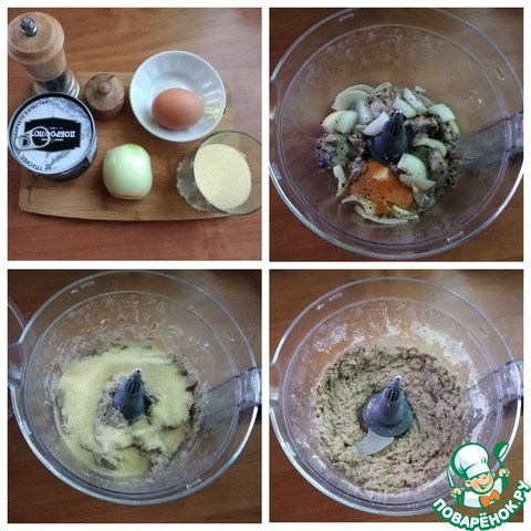 Готовим продукты для котлет. Консервы возьмите свои любимые натуральные или в масле. Котлеты из консервов в масле будут мягче и нежнее. Я люблю всякие. Фарш для котлет я буду делать в чаше комбайна. Открываем консервы. Если у вас много жидкости в них, то её нужно слить в посуду. Выкладываем рыбу в чашу, режем лук произвольно, отправляем туда же, разбиваем яйцо и всё измельчаем. Насыпаем манку, добавляем соль по вкусу и чёрный свежемолотый перец. Опять всё разбиваем. Даём постоять, чтобы манка разбухла. Если фарш получился очень плотным, то можно добавить слитую жидкость из-под консервов понемногу.