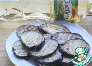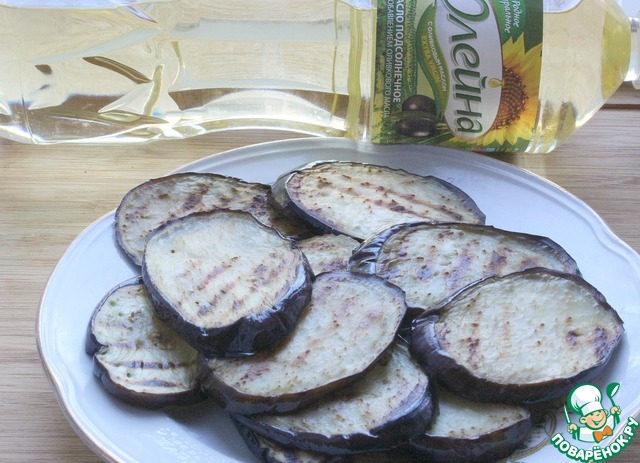 Обжаренные баклажаны сложить нв блюдо и немного остудить.
