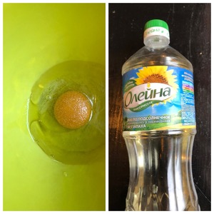 В посуду для замешивания теста выложить яйцо, пару щепоток соли и 3 ст л масла Олейна. Взбить венчиком.
