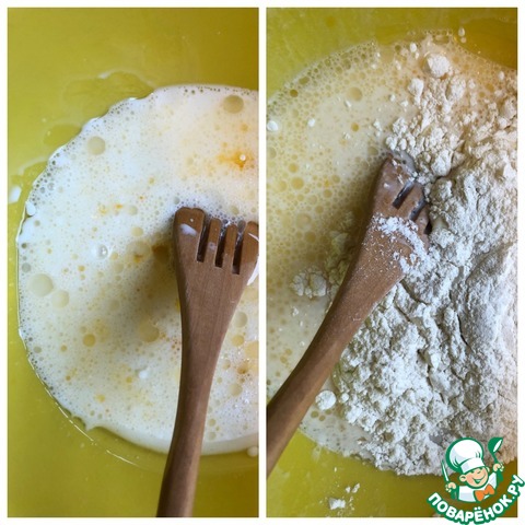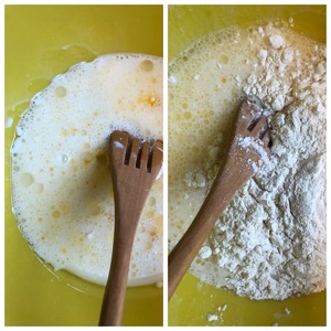 Влить молоко, взбить секунд 10 и частями всыпать муку, вымешивая тесто сначало венчиком, затем руками. Молоко и яйцо должны быть холодными, из холодильника.