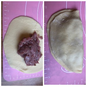 Раскатать шарик достаточно тонко и выложить в центр фарш. Свернуть заготовку пополам и рукой прижать, как бы расплющить заготовку.