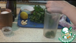 Добавляем к мяте чеснок, сок лимона, специи, соль, перец, оливковое масло. Измельчаем все блендером в однородную массу.
