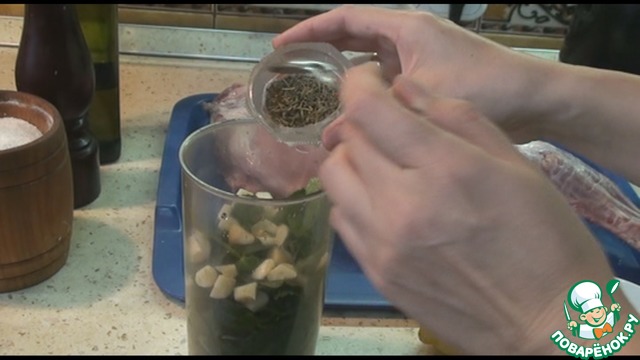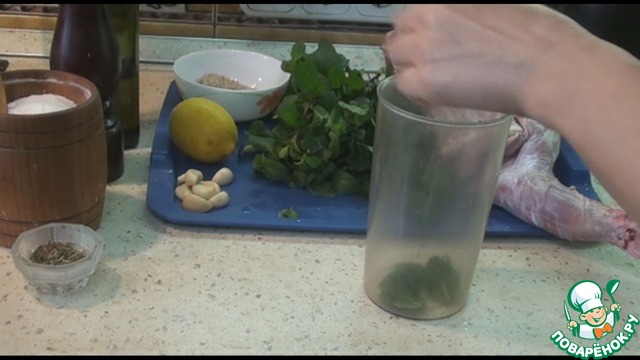 Отделяем листочки мяты от веточек и складываем в чашу блендера. Веточки не выбрасываем, а выкладываем на противень, на них будем запекать ногу.