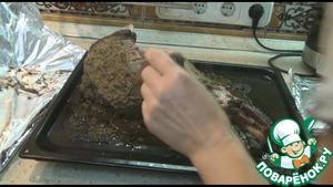 Накрываем фольгой и отправляем в духовку. Сначала запекаем 25 минут при 250 градусах, потом убавляем до 180 и запекаем ещё час.