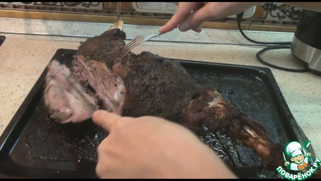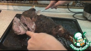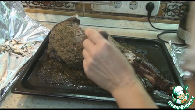 Достаем мясо из духовки, убираем фольгу. Мясо почти готово, отправляем еще на полчаса в духовку, чтобы покрылось корочкой. Время запекания может отличаться в зависимости от веса ноги. Проверяем готовность протыкая мясо возле кости, должна течь прозрачная жидкость. Мясо должно быть мягкое.