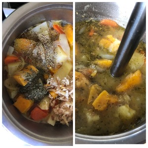 Когда суп закипит, добавить все специи и соль. Имбирь натереть на крупной тёрке и добавить к супу. Перемешать и варить суп на медленном огне до полной готовности овощей. Пюрировать суп погружным блендером.