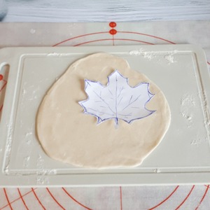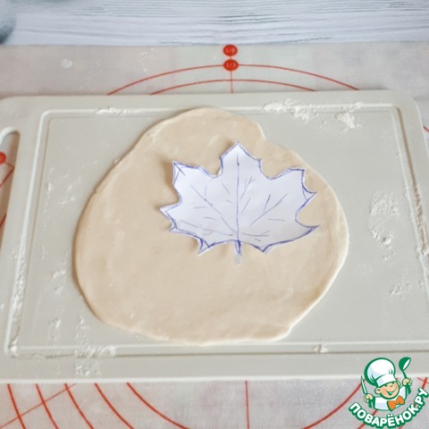 Теперь берем белое тесто, раскатываем его и вырезаем с помощью трафарета кленовые листья четыре штуки.