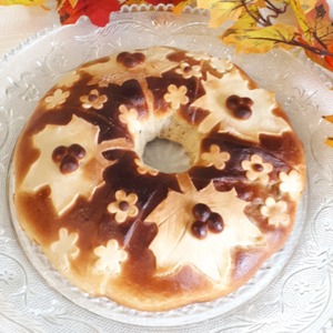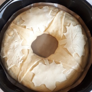 Поверхность пирога смазать яйцом с водой, положить на пирог вырезанные листья.