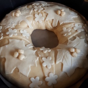 Украсить цветочками пирог как на фото. Из дрожжевого теста скатать маленькие шарики и разложить их на листья.