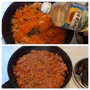 На сковороде пассеровать лук и морковь с 2-мя ст. л растительного масла, затем добавить фарш, посолить, поперчить по вкусу и жарить до готовности. Жаренные грибы соединить с готовым фаршем.