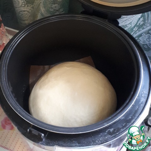 Поместить тесто в теплое место для подъема. Для этих целей я использую мультиварку, нагреваю чашу на функции подогрев и отключаю. Как только тесто увеличится в объеме, обмять его и дать снова подойти.