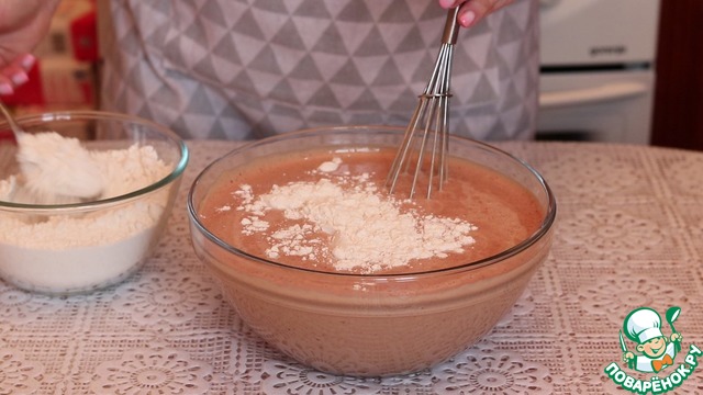 Переливам в большую миску. Добавляем молоко, муку и тщательно вымешиваем. По консистенции она должна напоминать тесто на оладьи.