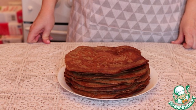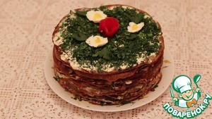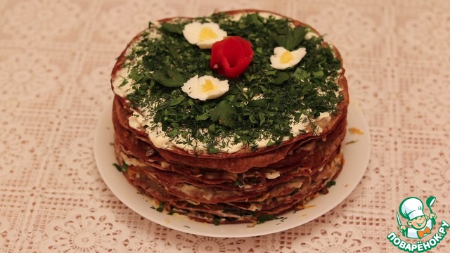 Собираем торт. На тарелку выкладываем блинчик. Смазываем чесночным майонезом и выкладываем начинку. Так поступаем со всеми блинчиками. Верхний блин просто смажем майонезом и убираем в холодильник на ночь. За это время он хорошо пропитается.