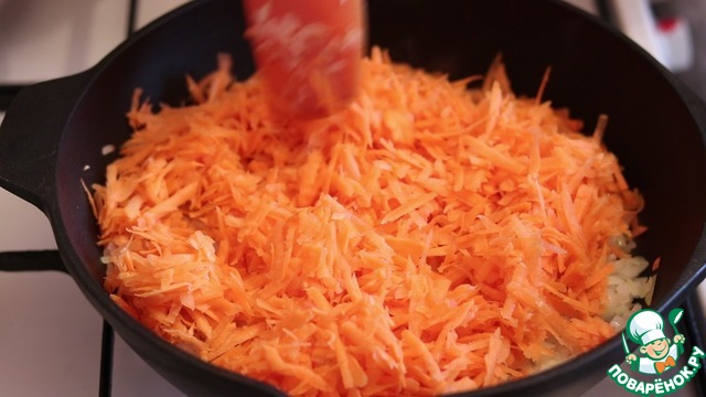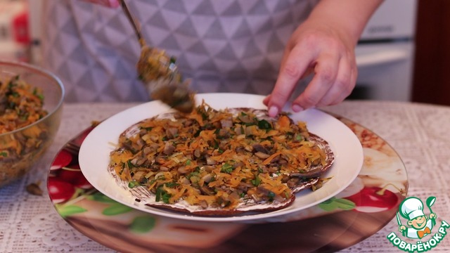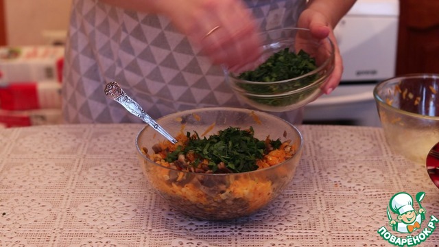 Обжаренные лук, морковь, грибы и зелень смешиваем. Это у нас будет начинка.