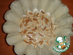 На смазанную маслом форму выложить миндаль. Я его слегка порубила ножом.