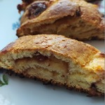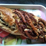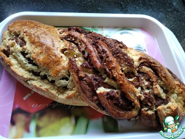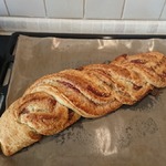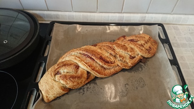 9. Разрезать получившийся рулет вдоль на две части не доходя до края. Две части теста "заплести", накладывая одну часть на другую