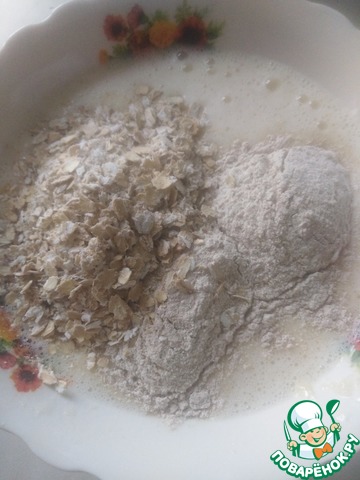 Добавьте муку, смешанную с разрыхлителем, отруби и овсяные хлопья.