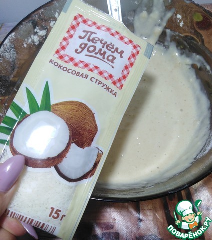 Муку смешать с разрыхлителем и посеять в яичную смесь, всё смешать до однородной массы. Добавить кокосовую стружку.