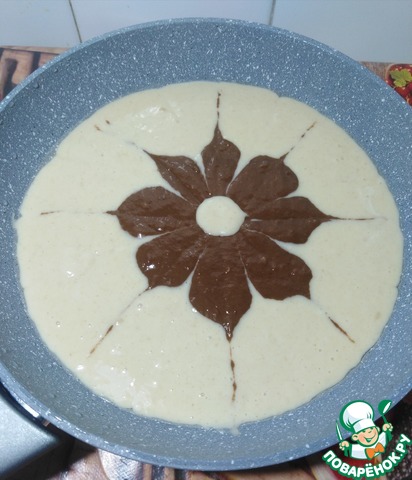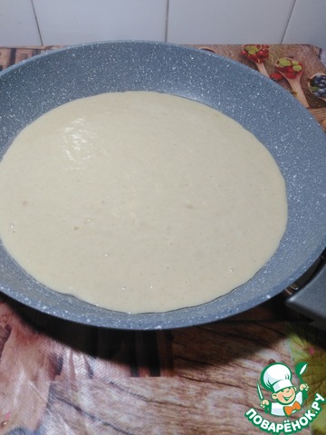 Сковородку смазываем маслом (у меня диаметр 26 см, антипригарная). Вылить белое тесто, распределить ровно.