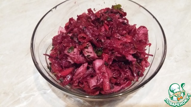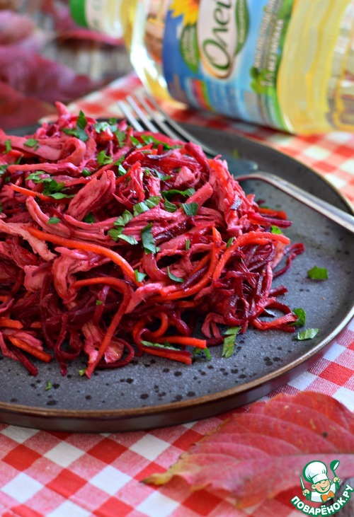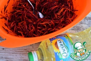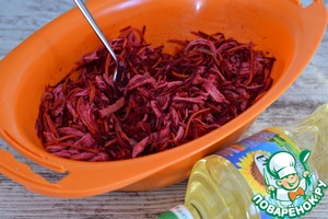 Свеклу (сырую) очистить и натереть на терке для корейских салатов. Можно воспользоваться обычной крупной теркой. Полить свеклу подсолнечным маслом (2 ст. л), перемешать. Я использую масло ТМ Олейна классическая.