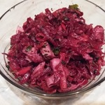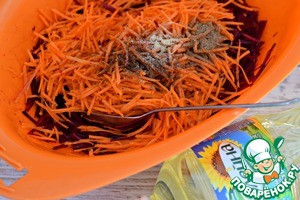 Выложить морковь к свекле, приправить овощи молотым кориандром, острым перцем (количество перца регулируйте по своему вкусу), добавить чесночный порошок, влить соевый соус и яблочный укус. -