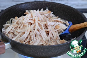 Отварное (запеченное, обжаренное) куриное филе (я готовлю салат из куриной грудки) разобрать на волокна и выложить в сковороду к луку.
