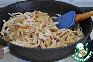 Хорошо перемешать и прогреть лук с куриным мясом в сковороде минуты 2-3. Огонь активный.