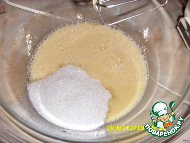 Делаем бисквит: яйца взбить добела, добавить сахар