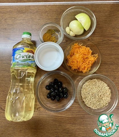 • Подготовить ингредиенты для дальнейшего приготовления: рис, натертую сырую морковь, лук, чеснок, соль, специи, маслины, масло подсолнечное.