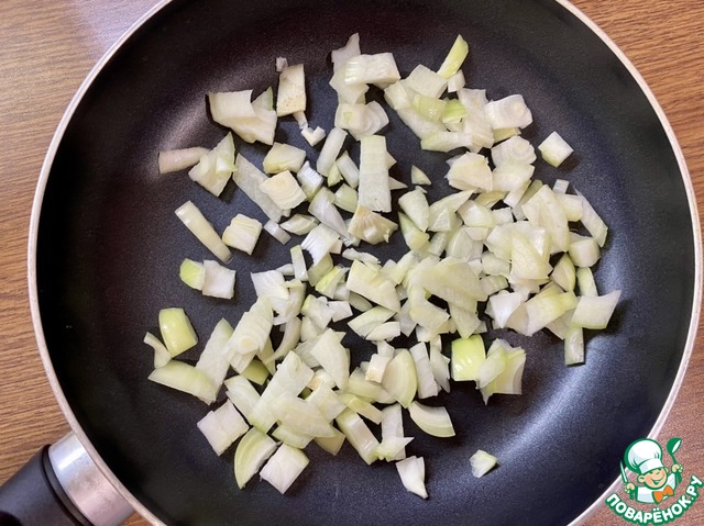• Нарезать репчатый лук (1 шт) кусочками среднего размера, положить на сухую сковороду, в которой будет готовиться готовое блюдо.