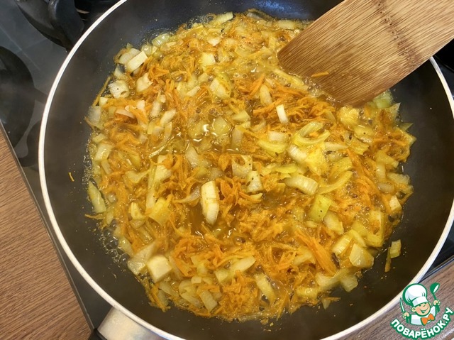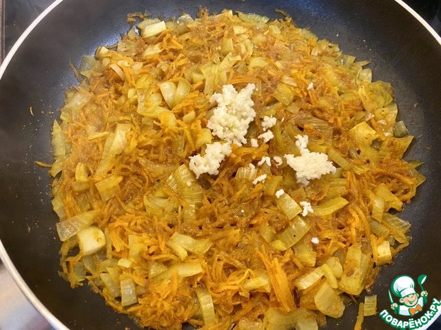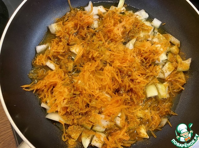• Добавить 50 гр. натертой моркови (на мелкой или крупной терке по желанию), 1 ч. л. приправы для плова, 1/4 ч. л. хмели-сунели, 1/4 ч. л. соли.