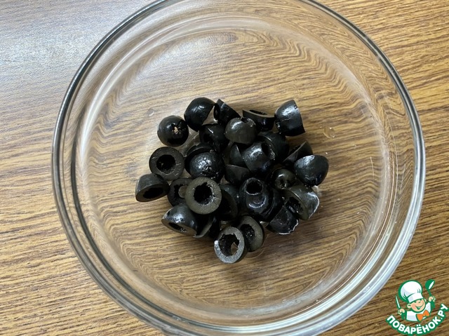 • Нарезать половинками маслины.