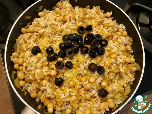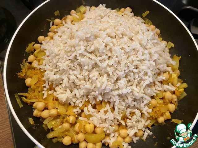 • Добавить рис к овощам и нуту, перемешать.