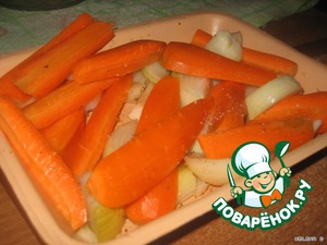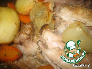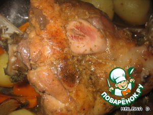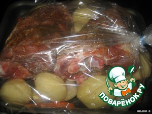 укладываем в рукав рульку,а сверху картофель,морковь и лук-выпекаем в духовке 2 часа при t 180 гр