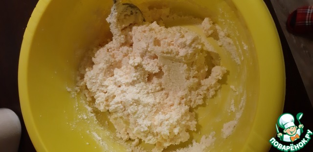 Творог протереть через сито или пробить блендером с оставшимся желтком и 1/3 стакана сахара. Если творог суховат, то можно добавить немного сметаны.