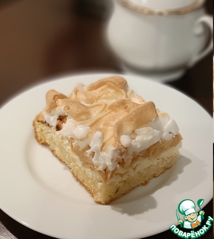 По истечении указанного времени достаём наш пирог, выкладываем на него белки и отправляем обратно в духовку минут на 15-20. Белки должны сверху немного схватиться и зарумяниться. -