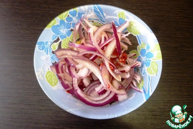 Приготовить заправку, смешав оливковое масло, соль, сок лимона и мед. Лук тонко нарезать перьями и отправить к заправке. Туда же мелко нарубить кусочек чили. Перемешать и дать постоять минут 15.