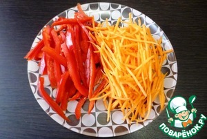 Сладкий перец нарезать соломкой, морковь натереть на специальной терке.