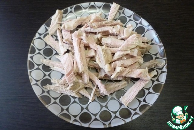 Отварную остывшую свинину нарезать соломкой.