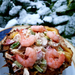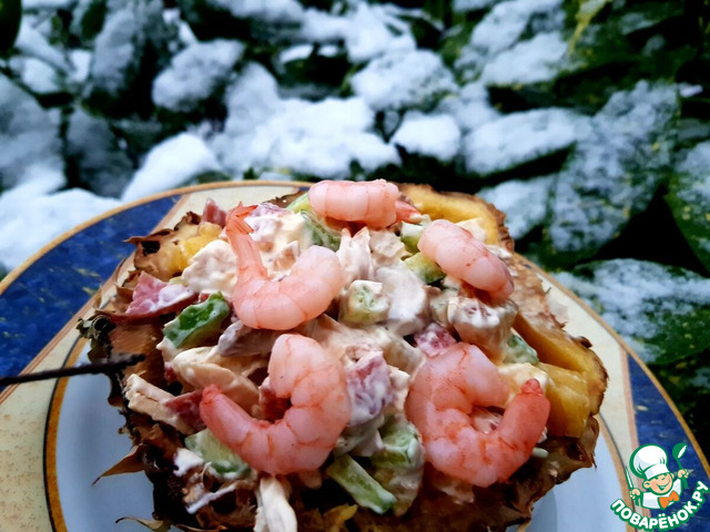 Думала на сайте вариантов такого салата множество, а оказалось нет (весь запрос по поисковику просмотрела). Думаю подачу такую, не один раз все видели, но так как на сайте еe нет.... В общем моя "корзинка", на Ваш суд. А если использовать ананасы поменьше, то можно подавать салат порционно. Очень подойдeт для романтического ужина.