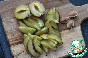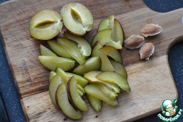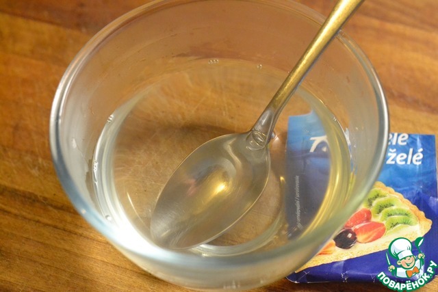 Желе для торта приготовить по указанной инструкции и, когда желе начнет слегка застывать, нанести его на сливу.