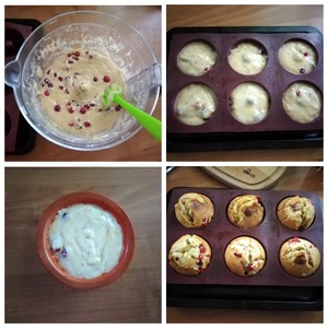 Добавляем клюкву в тесто и аккуратно, стараясь не давить, вмешиваем её. Берём формочки. У меня силиконовые. Я всегда их обливаю водой, перед выкладкой в них теста. Раскладываем тесто на 2/3 высоты. У меня получилось 6 шт кексов в формочках и ещё форма, размером с две формочки. Ставим в разогретую духовку до Т-180 С на 20 минут. Проверяем на "сухую лучину" Тесто к ней не пристаёт - готовы! Ориентируйтесь по своей духовке. Вот так они поднялись замечательно. Вынимаем из духовки и даём остыть.