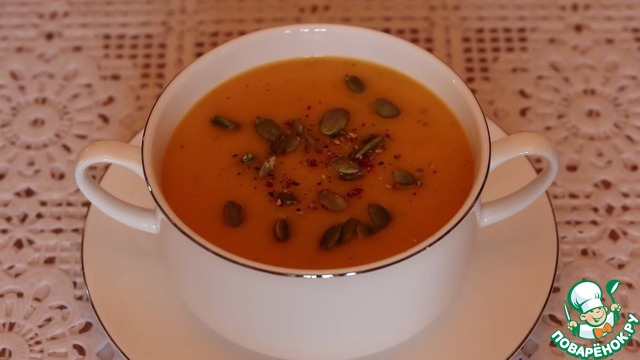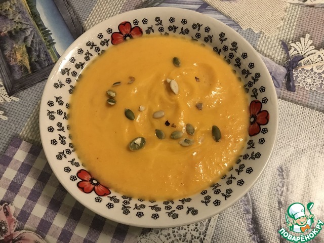 Суп готов. Его разливаем по тарелкам и украшаем тыквенными семечками. Можно пробовать и получать удовольствие.