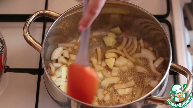 Последней отправляем в кастрюлю тыкву и обжариваем все 5 - 7 минут. После наливаем воду (бульон) 700 мл. и варим минут 20 - 25 до полной готовности.