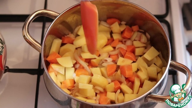 Морковь кладем в кастрюлю и обжариваем 3 мин.