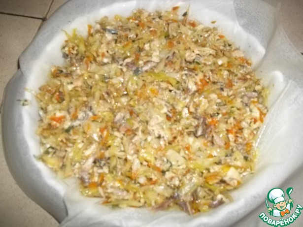 Приготовить начинку. Лук нарезать произвольно, морковь натереть на крупной терке, капусту нашинковать, зелень мелко нарезать.. В жаропрочной кастрюле или сотейнике разогреть масло, обжарить лук и морковь, добавить капусту, посолить. Накрыть крышкой и тушить, иногда помешивая. Незадолго до готовности капусты добавить зелень, смесь перцев и специи (у меня смесь из молотых кориандра, зиры, аниса и розмарина)